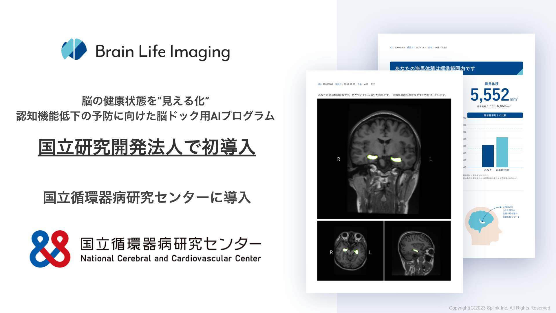 ブレインヘルスケア領域の医療AIスタートアップの株式会社Splinkは、自社で開発・提供する脳ドック用AIプログラム「Brain Life Imaging」が、国立研究開発法人 国立循環器病研究センター(理事長:大津欣也、以下「国立循環器病研究センター」)に採用されたことをお知らせいたします。なお、国立長寿医療研究センターや国立精神・神経医療研究センターなど国内で6拠点ある国立高度専門医療センター(ナショナルセンター)のうち、脳ドック用AIプログラムが導入されたのは、国立循環器病研究センターが初めてとなります。