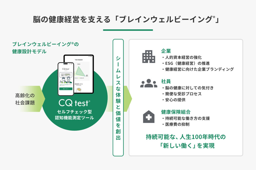 産学公連携により神奈川県内等における認知症未病改善を目的にセルフチェック型認知機能測定ツール「CQ test」を展開。認知機能低下を未病の段階で改善する「ブレインウェルビーイング」を推進