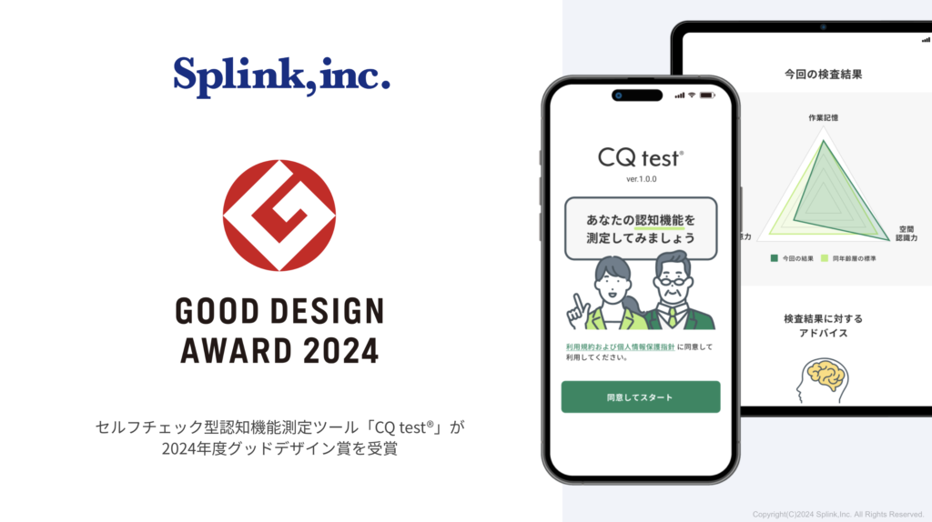 ブレインヘルスケア領域の医療AIスタートアップ、株式会社Splink(本社:東京都港区、代表取締役:青山 裕紀、以下「Splink」)は、当社が開発・提供するセルフチェック型認知機能測定ツール「CQ test」(https://www.brain-life-imaging.com/cqtest.html)がこのたび「2024年度グッドデザイン賞」(主催:公益財団法人日本デザイン振興会)を受賞したことをお知らせいたします。なお、本受賞は「認知機能テスト」として初めての受賞となり、高齢化が進む現代社会における健康経営や人的資本の維持に貢献する革新的なデザインが評価されました。