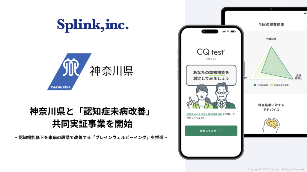 ブレインヘルスケア領域の医療AIスタートアップ、株式会社Splink(本社:東京都港区、代表取締役:青山 裕紀、以下「当社」)は、神奈川県(知事:黒岩 祐治)と共同で、認知症未病改善を目的とした実証事業を開始することに合意いたしました。本実証は、産学公連携を活用し、認知症の未病改善に向けた新たなアプローチを開発し、神奈川県内での地域展開を目指すものです。
