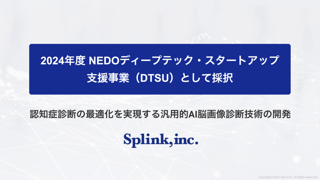 「認知症診断の最適化を実現する汎用的AI脳画像診断技術の開発」がNEDOディープテック・スタートアップ支援事業(DTSU)として採択 https://www.splinkns.com/2024-12-16/ https://www.splinkns.com/2024-12-16/#respond Mon, 16 Dec 2024 06:25:05 +0000 https://www.splinkns.com/?p=655