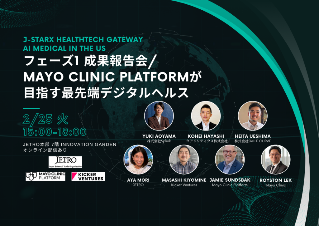 一方、海外市場への展開においては、高齢化が進むアジア・欧米の課題解決に貢献するため、日本貿易振興機構(ジェトロ)主催「HealthTech Gateway “AI Medical in the US”」Phase 2に選出されました。この取り組みの一環として、米国を代表する医療機関の一つであるMayo Clinicが保有する医療データクラウドを活用し、AIモデルの開発と米国市場への展開を目指しています。